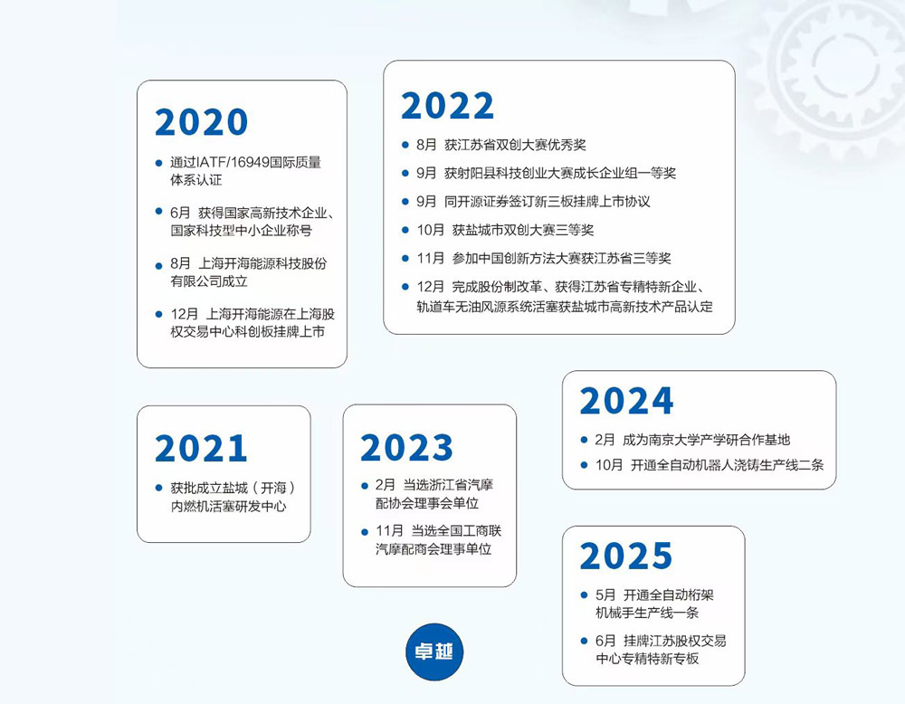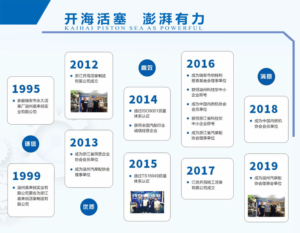 曾先后荣获四十一项国家实用新型专利,三项软件著作专利,五项发明专利,建立了盐城(开海)内燃机活塞研发中心,配备了意大利进口的GNR直读式光谱仪、金相显微镜、万能工具显微镜、材料拉力试验机、粗糙度仪、硬度计、活塞中凸曲线量仪等一系列检验、实验和测量设备。公司是市、省、国家级高新科技企业,是中国内燃机协会会员单位、全国工商联汽摩配商会理事单位。